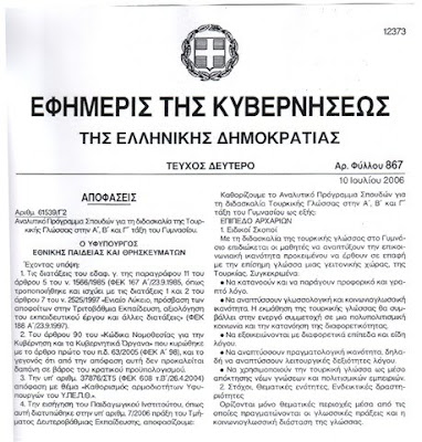 Ούτε αναφέρεται ότι η εκμάθηση της Τουρκικής θα είναι προαιρετική. (Παρακαλώ πάρτε και διαβάστε το πλήρες ΦΕΚ)
